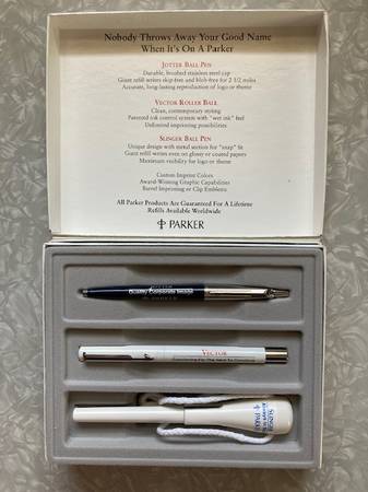VINTAGE PARKER PEN COMPANY "GIVE-AWAY" PEN SET for sale! The pen set is 100% ORIGINAL, NEW OLD STOCK, RARE, CLEAN and in EXCELLENT WORKING CONDITION (see pictures above)! The pen set was given out as a promotion to Parker Pen employee's. The pen set features 1 jotter (IIIL / 1993), 1 Vector (IIL / 1993) and 1 Parker Slinger (see pictures above). The pen set comes in a collector's display box w/ written descriptions of the pens (see pictures above). Comes from a private collection. Kept in a smoke and pet free environment. Asking $80 or best offer (cash only w/ local pick up). If interested please reply back to this posting, thank you.