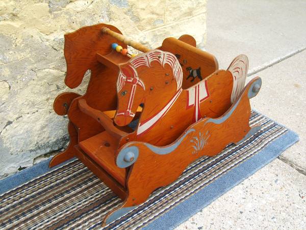 Offering a very old, antique children's horse swing, similar to children's rocking horses but it's a swing suspended on it's own base. It looks similar to the 1920's Mengel Playthings (Louisville, KY) Swan's Glider, but I'm not sure if it's actually a Mengel. Never seen anything like it and seems rare. Minor damage to a corner of the outside wood frame, but it is still very solid and the metal rod does not rely on that part of the wooden outside frame to hold the glider where the child would sit. Features 10-bead counter and old safety belt. It measures 32 3/8" long x 14 3/4" wide x 21" high.