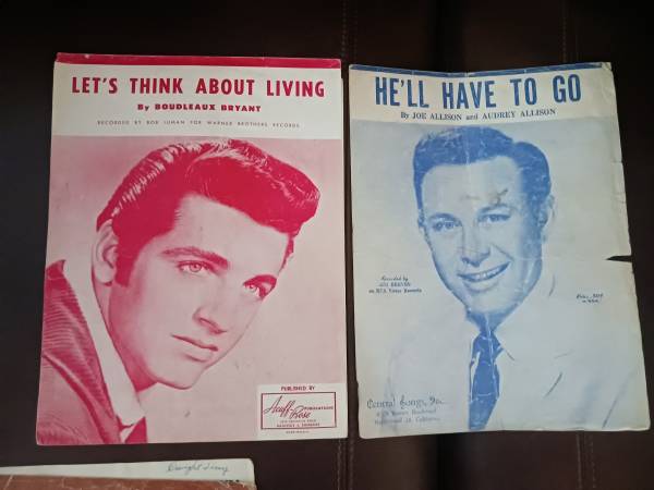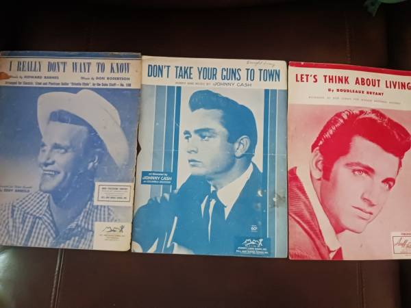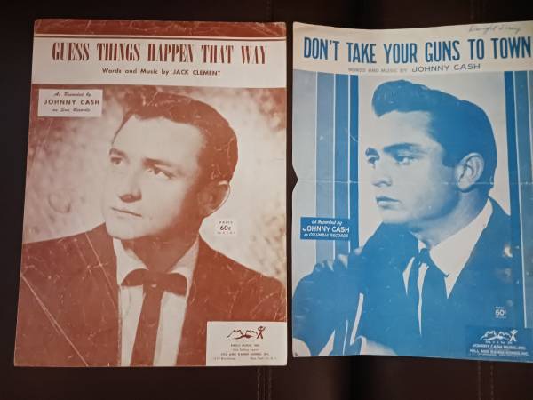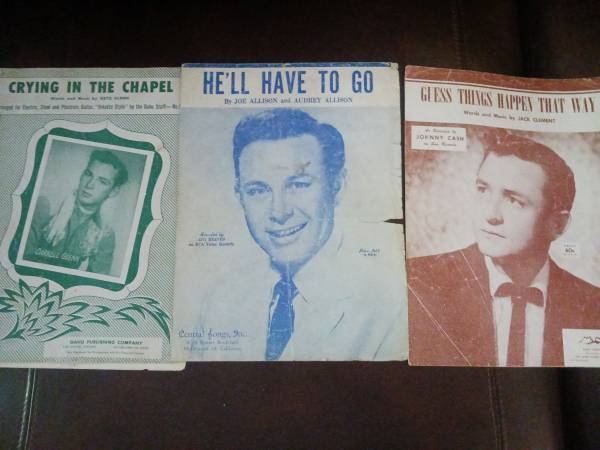 Offering ) five (5) famous hit songs of music and lyrics from six (6) different recording artist who all went on to become legends, They are Johnny Cash with his "Don't Take Your Guns To Town" and Guess Thing Happen That Way, Jim Reeves " He'll Have To Go, Eddy Arnold "I Really Don't Want to Know" and Darrell Glenn " Crying In The Chapel" All five booklets have seen wear and tear with creases-folded corners and maybe a slight tear here and there BUT in no way or fashion have the musical notes or lyrics become UN-readable or no longer legible . If you like what you're seeing I have more-MANY MORE. We can get together and do a bundle for quantity.My pigs with the pictures show six but one has been sold - Please match my listings with the pictures