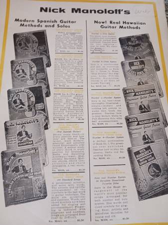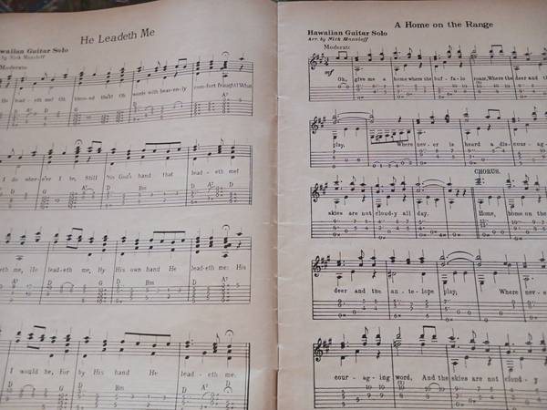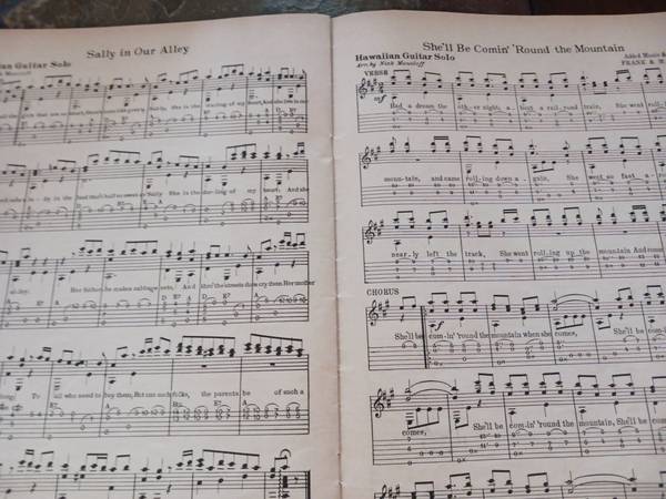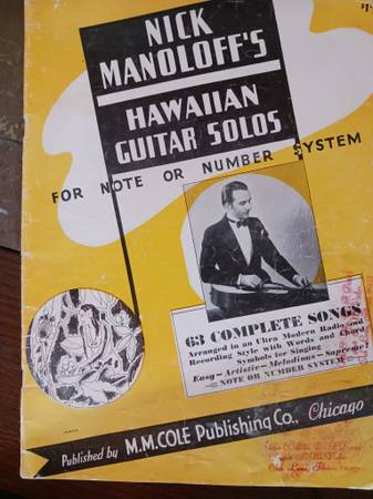 Offering a rare find and a good one for anyone interested in sheet music -Hawaiian Guitars- old booklets. I have a Booklet from 1936 published by MM Cole with sixty two (62) songs like Frankie & Johnny, The Spanish Cavalier, Sweet & Low, Jesus Loves Me,It's Time To Say Aloha, ETC Booklet itself is in great shape with no torn pages,no rips, no stains some discoloration from white to off white but not yellow.