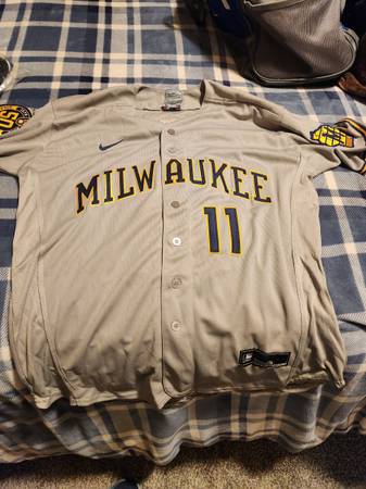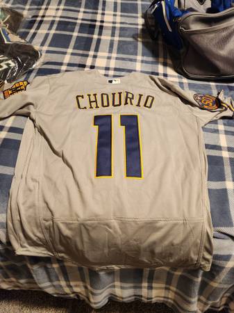 Jackson Chourio Brewers Jerseys. I have med large xl xxl xxxl in mens home navy blue and road gray. These are Nike all sewn on numbers letters and patches.