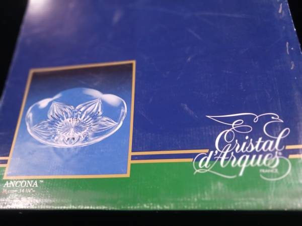 Offering a 14.25" crystal serving platter made in France under the name of ANCONA by Cristal d'arques. Serving platter is 14.25" round and 3" deep. Has cut decor into platter giving it some class without being flashy. Platter was made in 1991 but has never been out of the box for use or display.