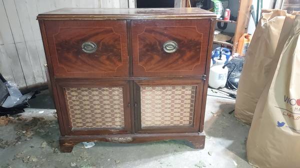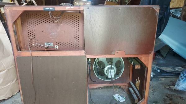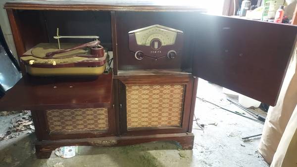 1951 Zenith AM-FM Radio Phonograph Console. Model J880R. Tubes test good, powers on but radio needs dial cord and electronic restoration (I can supply most parts needed & schematic ). Plastic & grille are in good condition, radio has nice size output transformer. Turntable operates (33-45-78 RPM mono) but needs stylus. Cash, PayPal or Venmo payments only, no paper payments please.