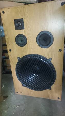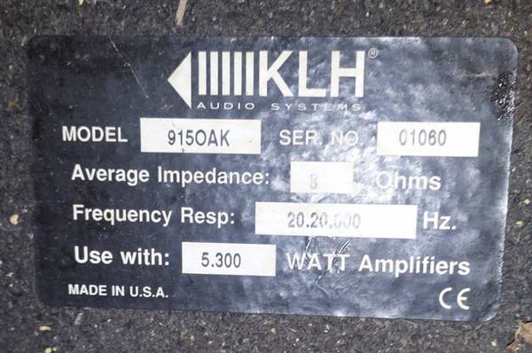 Pair of KLH model 915-OAK speakers, rated 300 watt with 15 inch woofers and protective grilles. Cabinets are kind of scruffy but speakers work fine. Size 33 inches tall X 19 wide X 11 deep. The woofers themselves ought to be worth $100. Can demonstrate. Cash, PayPal or Venmo payments only, thank you!