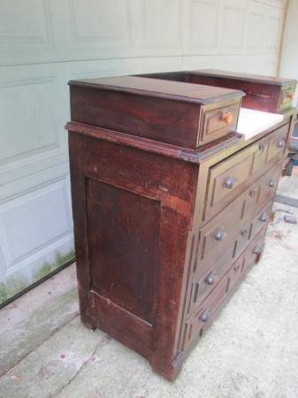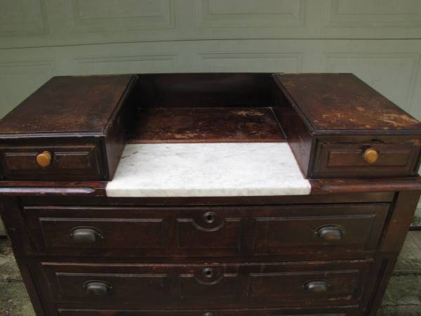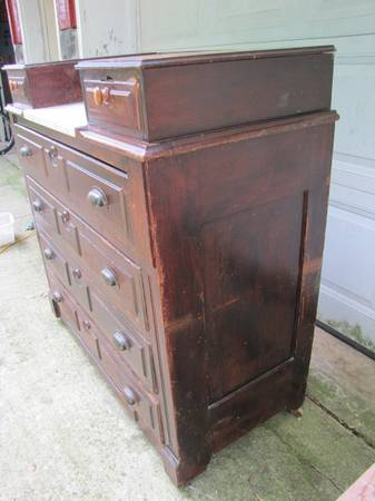 Old Victorian dresser with marble top. I bought it in the hopes of fixing it up and using it, but don't have the space in my garage for it anymore. It needs someone to give it some TLC. It would look great if it was striped and refinished. The marble is still in good condition, and it has a lot of potential if someone were to take the time to fix it up.