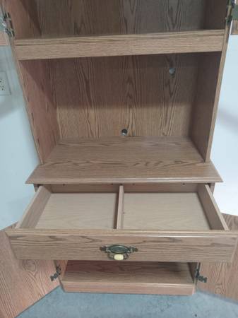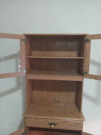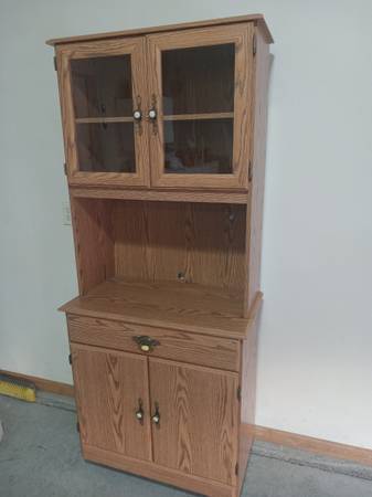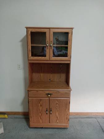 Space-saving microwave hutch which is 31" wide overall and 70" tall. The middle, microwave, area is 16" deep, 28.25 inside width. 19.5" height clearance. There are two holes in the back panel for electrical plug wire.0
