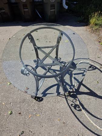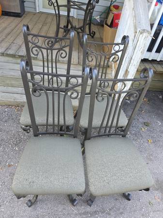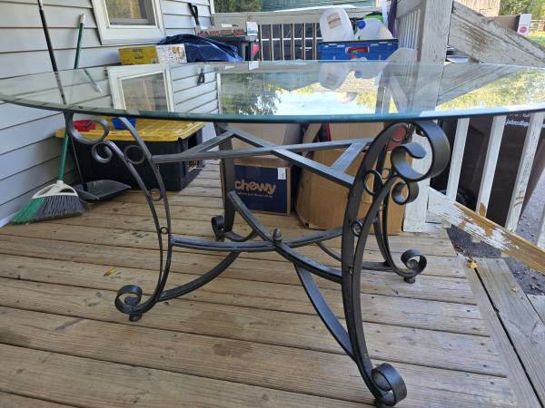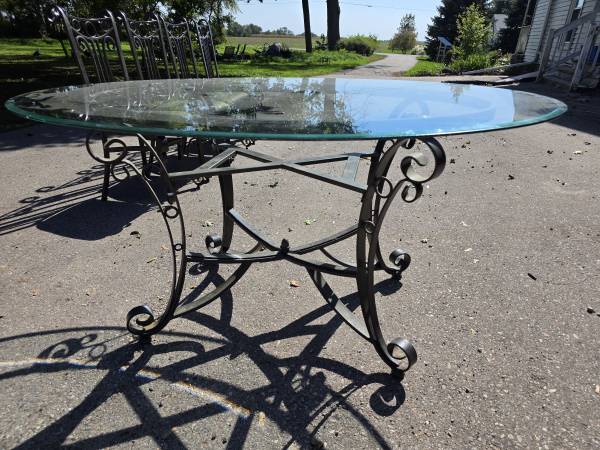 Beautiful wrought iron table with a glass top and 4 wrought iron cushioned chairs Glass table top measures 5' long x 42" wide $150