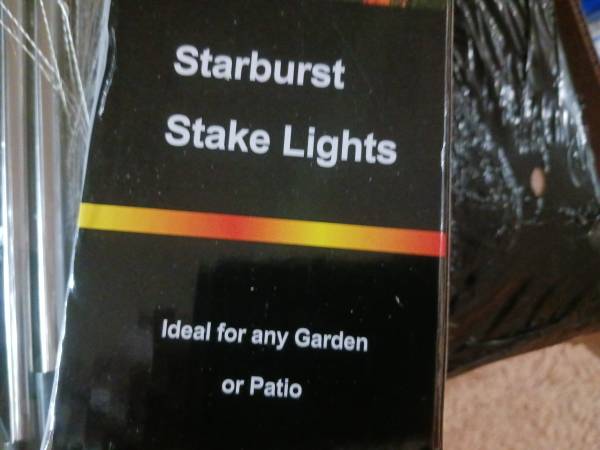 Offering two (2) completely different sets of Solar Lighting for along your driveway-lawn-garden-party and or outside decoration. Both are new and still in the original boxes. One is a set of Nine (9) individual white lights measuring from top to bottom of stake post 12.6" and a little less than 2" is diameter. The other is a set of two (2) Starburst Stake Lights that resemble the 4th of July Fireworks or change the mode setting and it becomes Christmas Lighting. No Batteries for any of these they all work perfectly from the Sun .Come on at dark and go off during daylight Stake lights measure approximately 24" from top to bottom of the stake. Push the stake into the ground and you're done