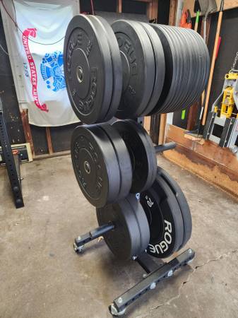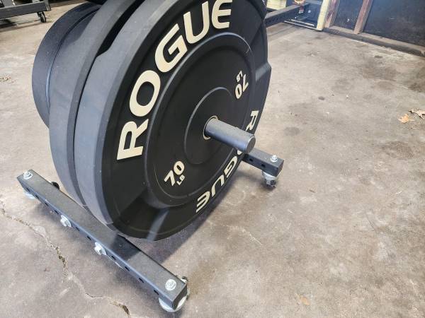 Rogue Fitness Plates with Vertical Plate Tree w/ wheels.