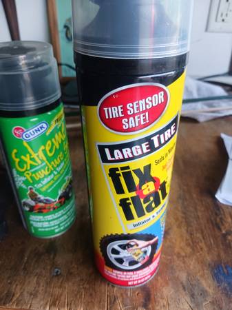 Offering two (2) new cans of emergency tire repair especially for those off roaders with UTV and ATV'S. 1st Can is a large 20 ounce can of SLIME for large tires . 2nd can is another large container of 20 ounces for large tires Fix A Flat Both cans have the adapter hoses so its just a matter of shake - connect and take off. I am also including a 12 ounce container of Complete Fuel System Cleaner made by Gold Eagle (Gunk) for improving acceleration it too is new and all three have never been used