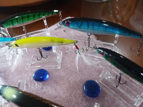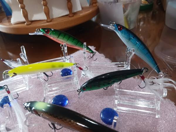 Offering eight new suspended and floating lures as follows: Lures #1-#6 are suspended lures described as 1-4 4.25" @ 3/16 ounces each being metallic blue body black back and black horizontal marks, metallic green black slashes orange belly,#3-#6 are 3 3/8 " @ 1/8 ounce each all four having tail feathers that glitter, lure#7 and #8 4.25" 3/16 ounce black and gold tiled white white spot on the head --#8 is pee wee 2.25" 1/16 ounce black and silver minnow Please look at all pictures closely as to what you see is exactly what you'll get metallic glossy finishes with dots-dashes-slashes-stripes -blotches What you don't see is that lures #1-#7 all have "BALLS" on the inside to act as attraction and teasing the predators so hopefully the BIG ONE will come a chasing. L-#56