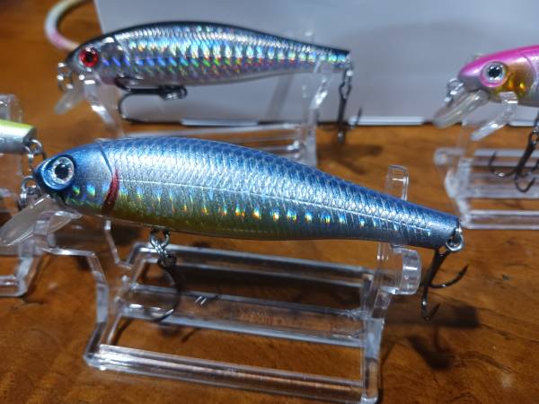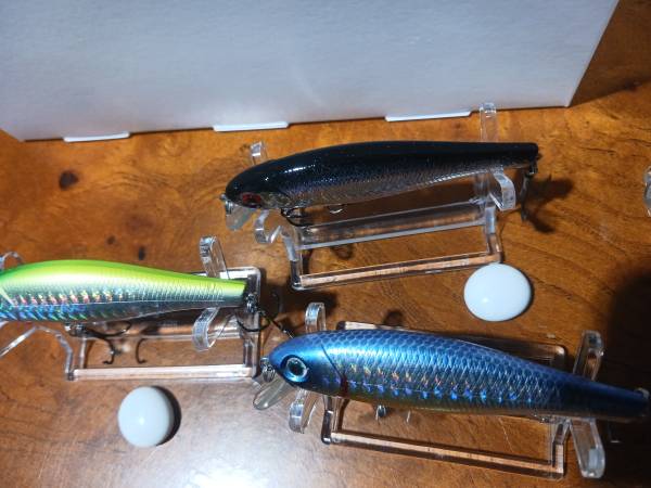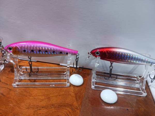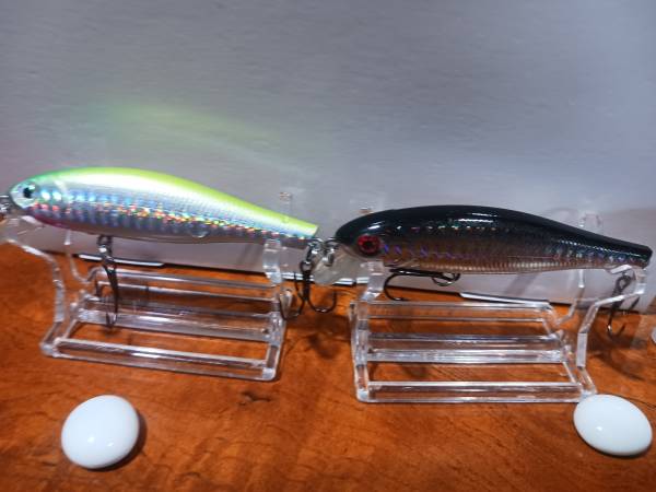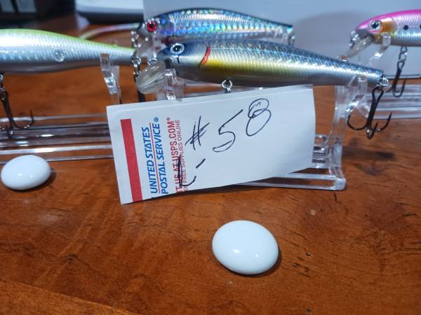 Offering five (5) all new floating fishing lures of the same size and weight with color variations. They 3.5" long and weighing 3/16 ounces each. Measurements are from the tail to the front of the lip (Bill) Please look at my pictures very closely for the vibrant colors with metallic glossy like finishes having dots,dashes,slashes,hash marks, some red eyes some white eyes, stripes etc. What you won't see is that all five lures have "BALLS" on the inside to make noise in attracting and teasing the predators. Hopefully this will give you an advantage in nailing the BIG ONE! And by the way all five will come to you in their own plastic tackle case that locks for transporting. L-#58