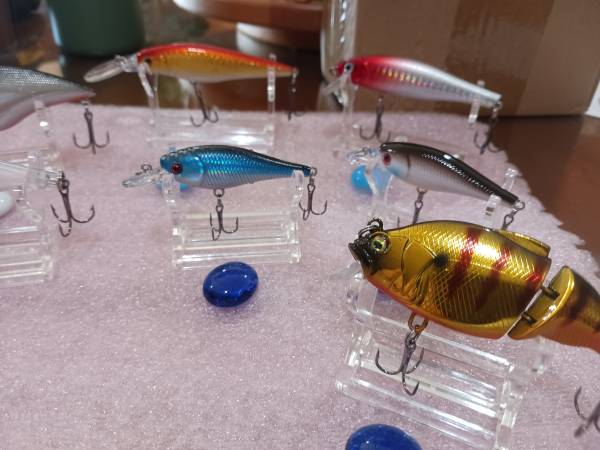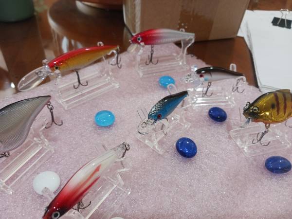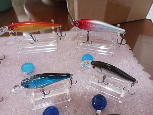 Offering seven(7) NEW sinking-floating-suspended fishing lures. All lure pictures have colored stones next to them which represents the buoyancy and all measurements are from tail to front of lip (Bill) They are as follows: Light Blue Stone = Floaters #1- 3.25" 5/16 oz silver metallic back and sides with red head and big eyes,2nd 4.25" 3/8 oz. reddish orange back silver sides extended tongue,White Stone =SINKER #4 2.75" 1/2 0z. black back silver sided orange belly lip less "Fat Guy". #4 3.25" 5/16 oz. silver sided red head with flames on side,Dark Blue Stones = SUSPENDED #5 2.5" 1/8 oz black back blue sides silver belly,#6 2.25" 1/8 oz. dark brown back white sides blue face dot,#7 3" 1/4 oz jointed black back golden sides with vertical red stripes.#1 and #2 have "BALLS" to attract the fish as noise makers T-#14