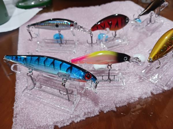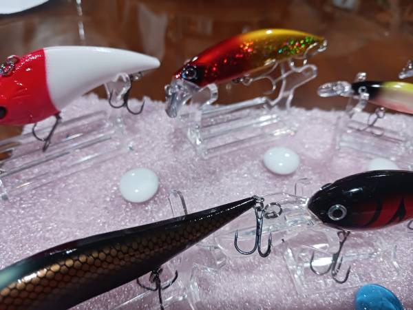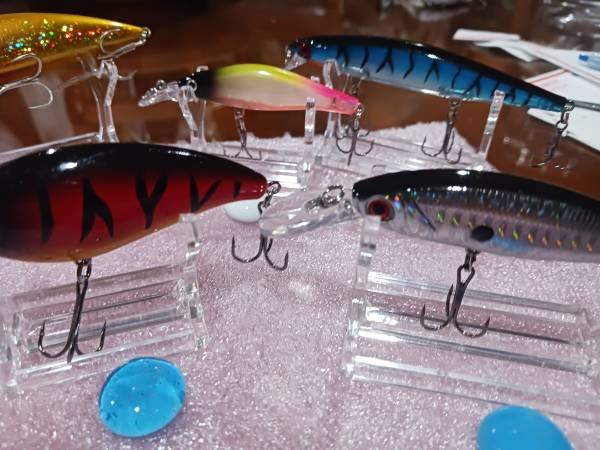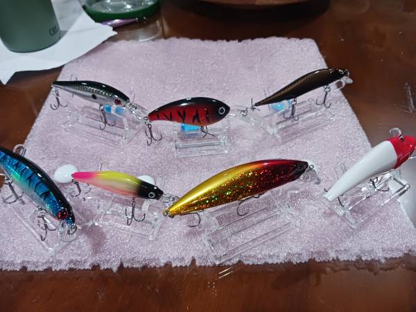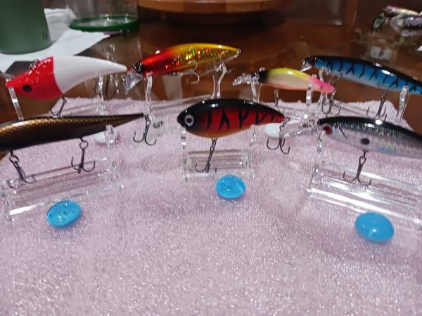 Offering seven (7) new sinking and floating lures. Each lure picture has a colored stone next to it representing the buoyancy. All measurements are from the tail to the end of the lip (Bill) White Stones are Sinkers and Light Blue stones are floaters, They are as follows: Sinking Lures are #1 3 1/8 " long and 1/8 oz multi colored Clown chartreuse back orange belly and tail, silver sides with black face. #2 4.1/2" 5/16 oz. black back metallic blue sides having black vertical stripes red eyes and a bleeding chin, #3 4.1/4" long 1.1 oz weight (Fatso) golden speckle body with speckle red face , #4 3.5" long 3/8 oz. red head white body lip less, Light Blue Stones = Floaters #5 4" 1/8 oz brown and black tiled body with gray spot on the head, #6 Black and Silver minnow weighing 5/16 oz #7 4" long 3/8 oz. dark back reddish sides and black vertical stripes tan belly, Lures #3-#7 have "BALLS" as noise makers attracting the predators, Lures #1,#3,^, #7 have extended tongues. L-#31