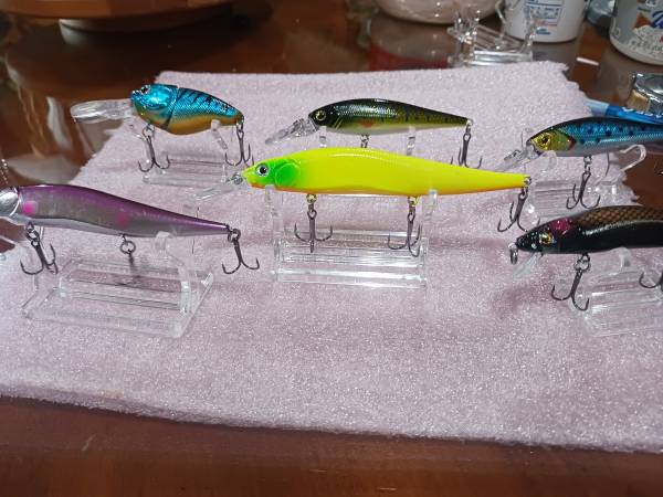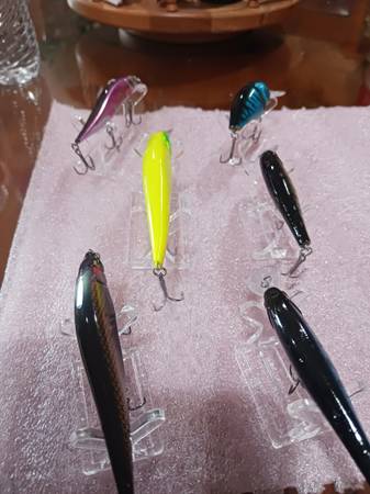 Offering six (6) all new floating fishing lures five having "Balls" and attract and tease other fish -- all measurements are from front of lip (Bill) to the tail, They are as follows:#1 5.1/4" 5/16 oz. Chartreuse body with green face and orange belly, #2 4" 1/16 oz. purple metallic with silver sides and red blotches to the sides, #3- 4' 1/4 oz black and gold tiled with gray spot on head and red blotch on face, #4 4" 1/16 oz. black back metallic blue sides with black dots and silver belly, #5 4" 1/16oz. black back "Baby Bass", #6 3 1/2" 5/16 oz jointed black back blue body gold belly. T-#20