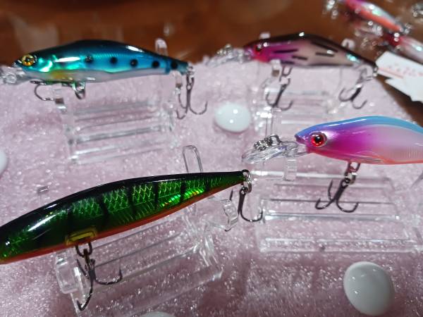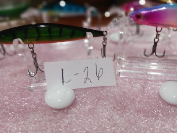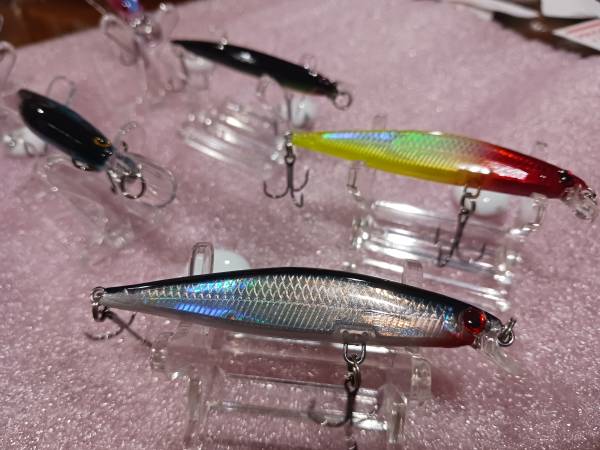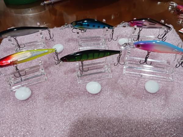 Offering six (6) new sinking lures.All measurements are from the tail to the front of the lip (Bill) They all are the same in length 3 1/8" and weight is the same 1/8 ounce. #2 black back with silver sides like a minnow, #2 Black back with metallic blue sides having horizontal black dots extended tongue #3 dark maroon back light purple sides red face and horizontal black lines , #4 chartreuse back silver sides red head extended tongue, #5 light black back metallic green sides orange belly vertical black stripes like a perch, #6 ais a Clown fish with multi colors of light blue silver sides orange belly red face and an extended tongue. L-#26