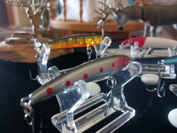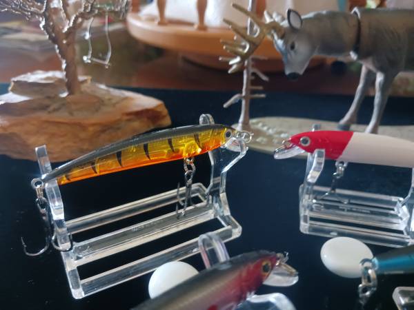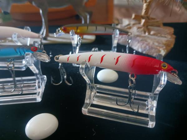 Offering six (6) new small sinking fishing lures all with the same weight of 1/8 ounce and same length of 3". All measurements are from the tail to the tip of the lip (Bill). Please look at my pictures very closely because as to what you see is EXACTLY what you'll be getting.Please notice the brilliant vibrant colors some with a metallic finish while some don't. Please notice the dots-dashes-horizontal and vertical hash marks- the slash blotches- some with red eyes and others clear. What you won't see is the fact that all six lures have "BALLS" --all on the inside to make noise while teasing the predators into a chase or a feeding frenzy. Either way noise intended to give you a slight advantage in nailing that BIG GUY! L-#71