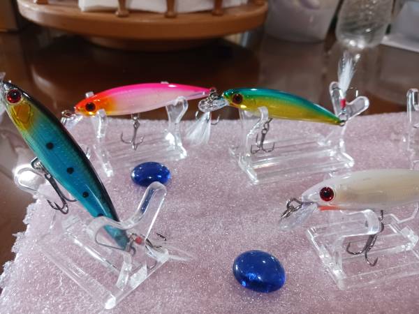 Offering six (6) new suspended fishing lures all weighing 1/8 ounce and measuring 3.25" in length from tail to front of lip (Bill) Please look at my pictures carefully as to what you see is exactly what you'll be getting. Notice the vibrant colors with metallic glossy like finishes have dots,dashes,slashes, hash marks red eyes and did you see they all have tail feathers that glitter. What you don't see is that all six lures have "BALLS" on the inside that make noise to attract and tease the predators. Hopefully giving you a slight advantage in nailing that BIG ONE L-#53