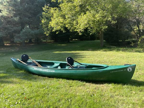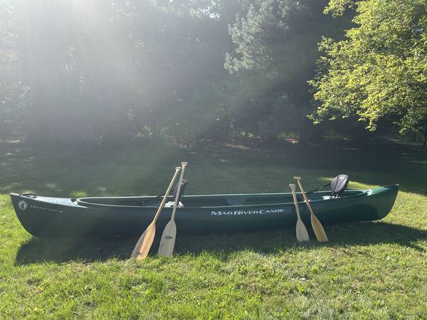 Mad River Adventure 17 canoe with 3 seats. Includes 2 adult and 2 kid-size paddles. Great canoe for exploring, especially with kids!