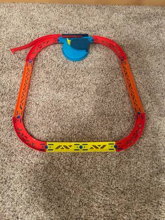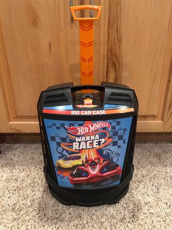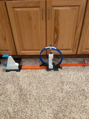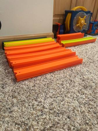 Huge lot of Hot Wheels accessories, most like new and rest is good condition. Lots of track, various launchers, black carry case on wheels holds 100 cars, gas and police stations, bank vault, truck transporter holds 60 cars. The white tracks are for vertical installments with attachments, curved track set with launcher, loop with launcher