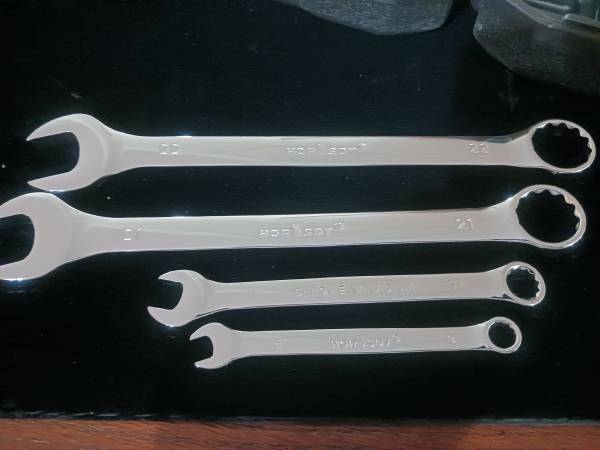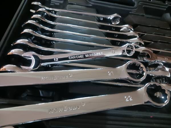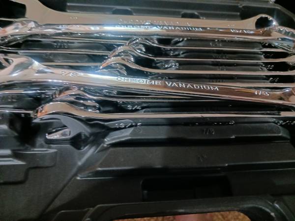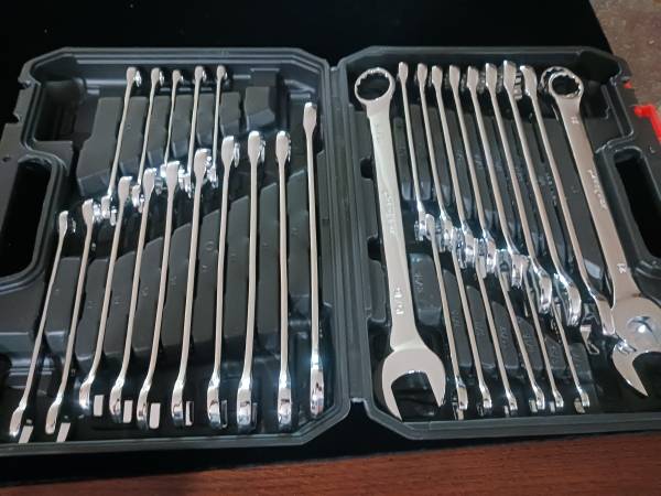 Offering a NEW set of Metric and SAE combination open end and box wrenches in its own carrying case. Wrenches are bright full polished chrome finish with offset on the box end for better access. Wrenches are also with the 12 point design. 16 Piece SAE sizes range from 1/4" to 1" and the metric wrenches range from 7MM- 22MM Another nice feature that the carrying case has two sturdy locks to prevent the tools from escaping out of the case NRS35-15
