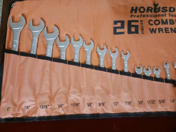 Offering a set of twenty six (26) combination open end and boxed end wrenches . There are 13 SAE sizes ranging from 1/4" to and including 1" while the other 13 are Metric ranging from 8MM to and including 24MM. All wrenches will come in a bright orange canvass bag with metal grommet holes for mounting to the wall keeping your wrenches where you can always find them by not being scattered all over the place All wrenches are chrome vanadium with high polish finish to prevent rust. NRS#0826463452